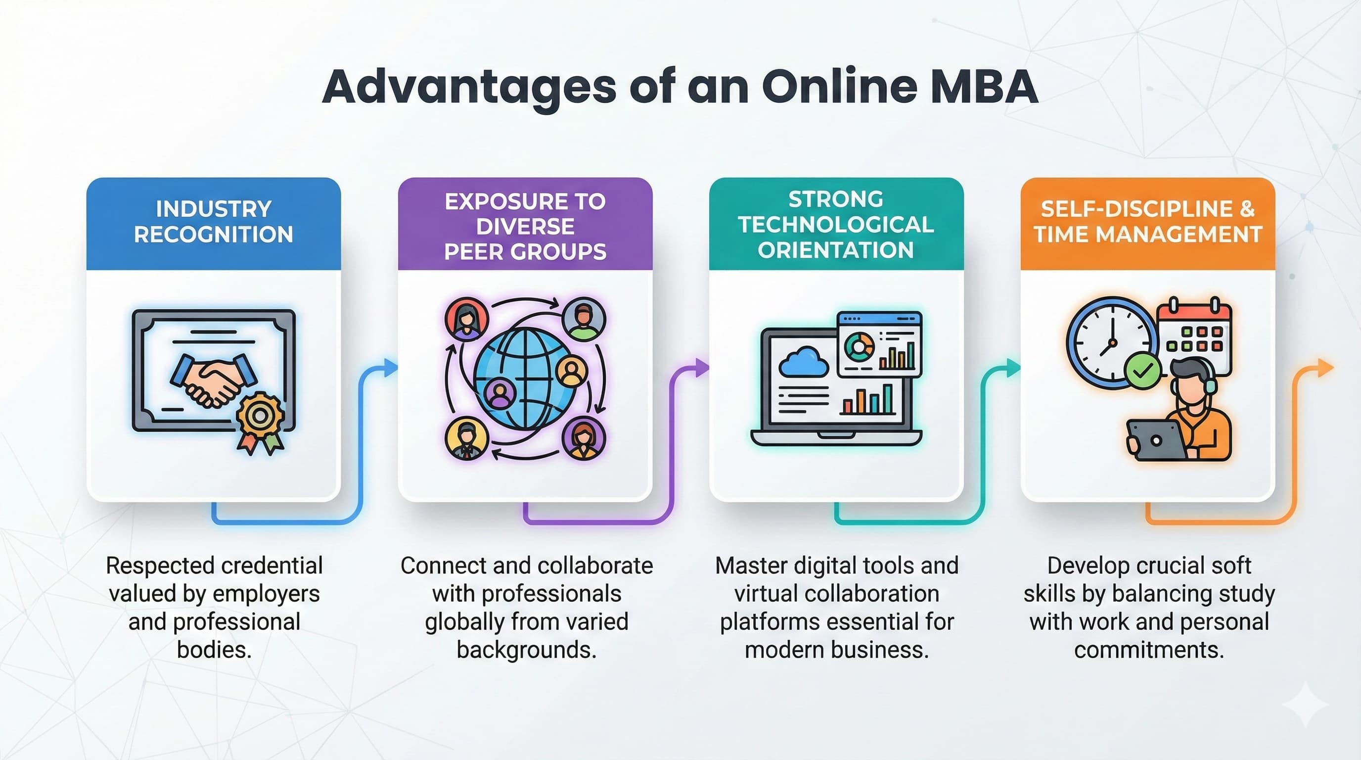 2. Growth in Diversity: An online MBA can be a game changer as it allows people from all walks of life to broaden their horizons. For working executives and their companies, online learning is cost-effective, student-centered, and convenient. Interacting with a diverse group from across the globe makes the participants culturally adaptive and respectful of diversity. The opportunities to connect with individuals sometimes on a global level, is also another reason why the value of an online MBA is high.