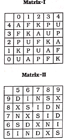 Question : Direction: A word is represented by only one set of numbers as given in any one of the alternatives. The sets of numbers given in the alternatives are represented by two classes of alphabets as in the two matrices, given below. The columns and rows of Matrix (I) are numbered from 0 to 4 and that of Matrix (II) are numbered from 5 to 9. A letter from these matrices can be represented first by its row and next by its column, e.g. 'F' can be represented by 30, 23, etc., and 'N' can be represented by 97, 89, etc. Similarly, you have to identify the set for the given word.