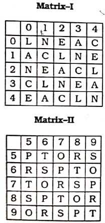 Question : Direction: In this question, a word is represented by only one set of numbers as given in any one of the alternatives. The sets of numbers given in the alternatives are represented by two classes of alphabets as in the two matrices, given below. The columns and rows of Matrix (I) are numbered from 0 to 4 and that of Matrix (II) are numbered from 5 to 9. A letter from these matrices can be represented first by its row and next by its column, e.g. 'A' can be represented by 22,10, etc., and 'P' can be represented by 55, 67, 79, etc. Similarly, you have to identify the set for the word.