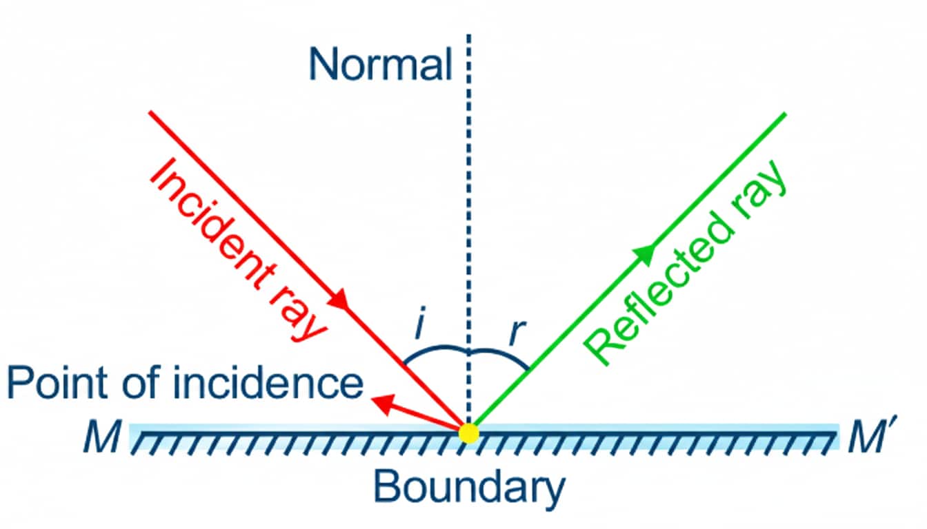 A light ray that strikes a surface is called an incident ray. The ray that depicts the light reflected by the surface is the reflected ray that corresponds to a specific incident ray. The angle of reflection is the angle formed by the surface normal and the reflected beam.