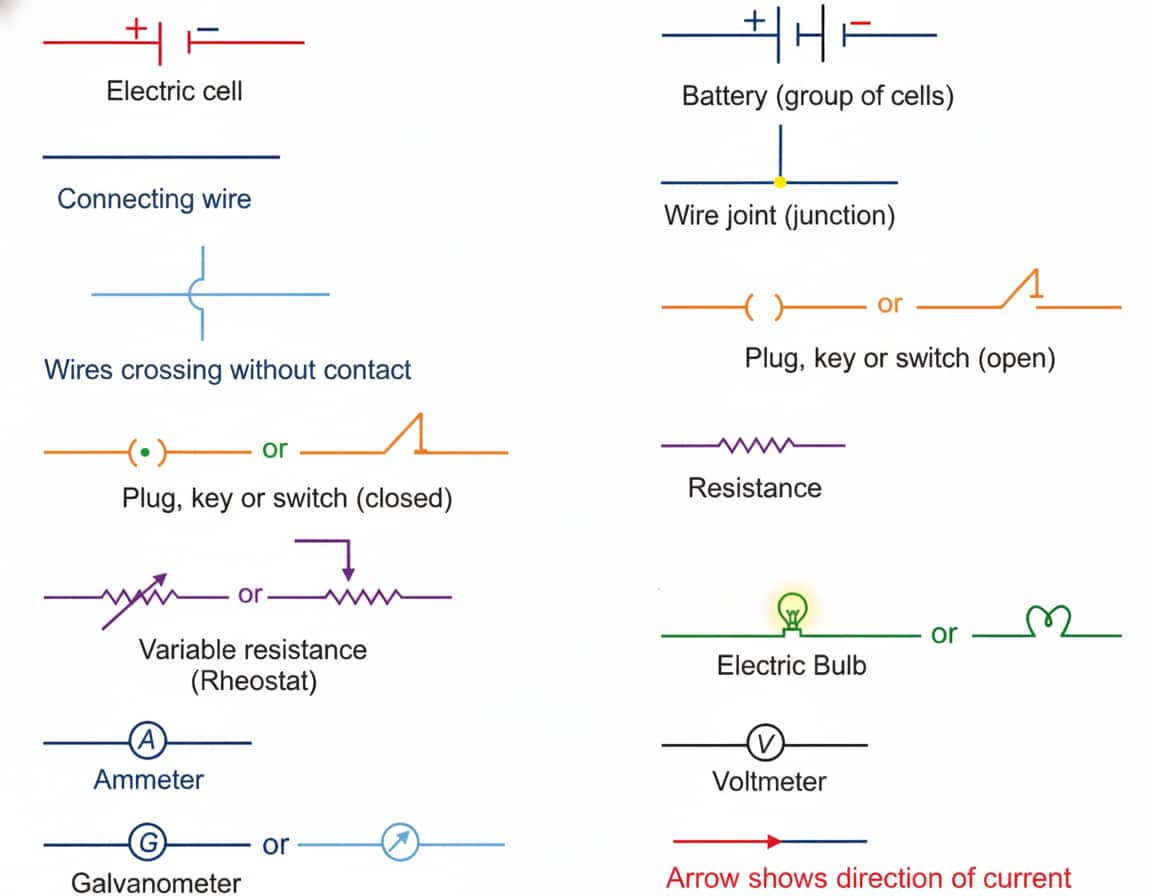 The various conventional electrical symbols used to represent some of the most commonly used electrical components in an electrical circuit diagram are as follows :