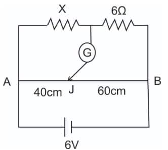 For the balanced bridge, the ratio of two resistances is equal to the ratio of the lengths of the two parts AJ and JB of the wire, i.e. $\frac{X}{6}=\frac{40 \mathrm{~cm}}{60 \mathrm{~cm}}$ or $X=4 \Omega$