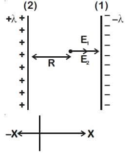 Two parallel infinite line charges with linear charge densities $+\lambda C / m$ and $-\lambda C / m$ are placed at a distance of 2R in free space. What is the electric field midway between the two line charges?