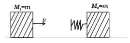 Two blocks $\mathrm{M}_1$ and $\mathrm{M}_2$ having equal mass are free to move on a horizontal frictionless surface. $\mathrm{M}_2$ is attached to a massless spring as shown in the figure. Iniially $\mathrm{M}_2$ is at rest and $\mathrm{M}_1$ is moving toward $\mathrm{M}_2$ with speed v and collides head-on with $\mathrm{M}_2$.