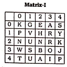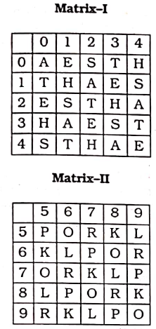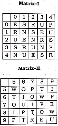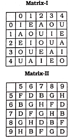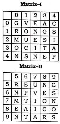 Question : Direction: In this question, a word is represented by only one set of numbers as given in any one of the alternatives. The sets of numbers given in the alternatives are represented by two classes of alphabets as in the two matrices, given below. The columns and rows of Matrix (I) are numbered from 0 to 4 and that of Matrix (II) are numbered from 5 to 9. A letter from these matrices can be represented first by its row and next by its column, e.g. 'G' can be represented by 01, and 'P' can be represented by 10, 44, etc. Similarly, you have to identify the set for the word.