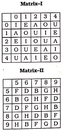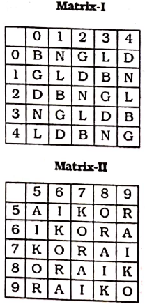 Question : Direction: In this question, a word is represented by only one set of numbers as given in any one of the alternatives. The sets of numbers given in the alternatives are represented by two classes of alphabets as in the two matrices, given below. The columns and rows of Matrix (I) are numbered from 0 to 4 and that of Matrix (II) are numbered from 5 to 9. A letter from these matrices can be represented first by its row and next by its column, e.g. 'A' can be represented by 12,24, etc., and 'R' can be represented by 57, 76, etc. Similarly, you have to identify the set for the word.