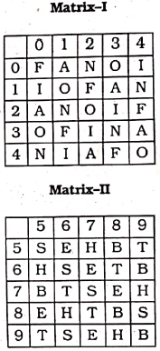 Question : Direction: In this question, a word is represented by only one set of numbers as given in any one of the alternatives. The sets of numbers given in the alternatives are represented by two classes of alphabets as in the two matrices, given below. The columns and rows of Matrix (I) are numbered from 0 to 4 and that of Matrix (II) are numbered from 5 to 9. A letter from these matrices can be represented first by its row and next by its column, e.g. A can be represented by 04,12, etc., and U can be represented by 59, 66, etc. Similarly, you have to identify the set for the word ROOT.