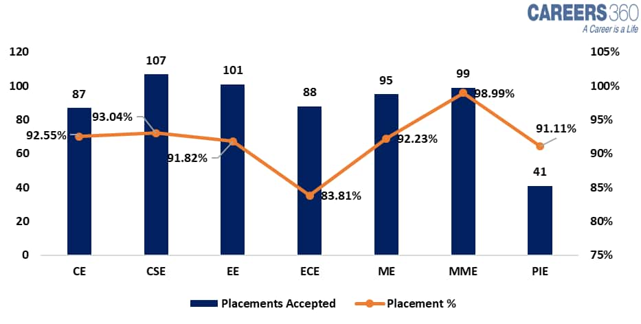 100% of B.Tech Metallurgical and Materials Engineering students, 94.90% of Civil Engineering students, 90.29% of ECE students, 92.59% Electrical Engineering students, 91.50% Mechanical Engineering students and 95.56% of Production and Industrial Engineering students got placed during NIT Jamshedpur BTech placements 2025.